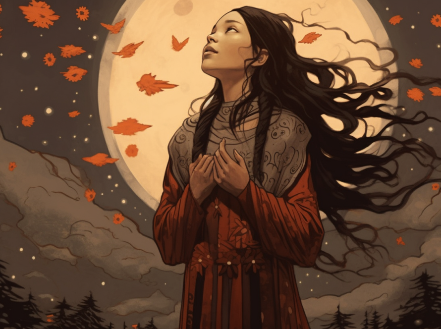 There are rocks cropping out from the water behind her, which tells us there are hidden answers in the unconscious and beneath your emotions.